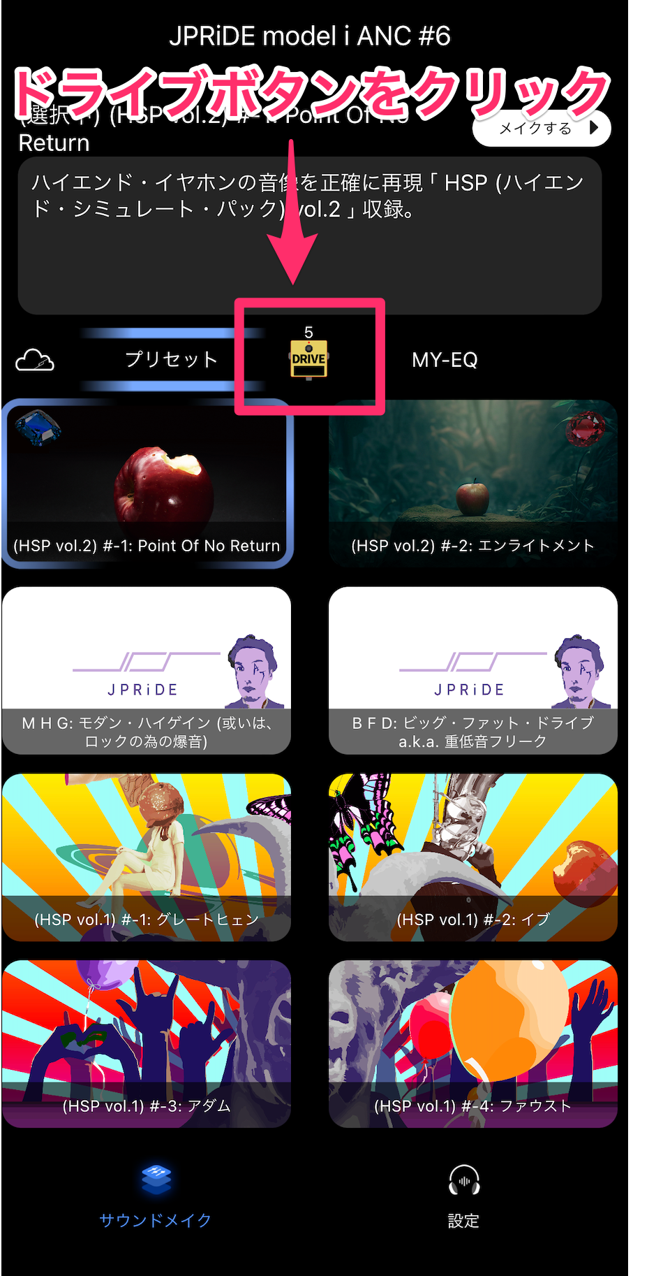 ドライブ設定を行うことで、プリセット音色の音圧を5段階で変更する事が可能となり、