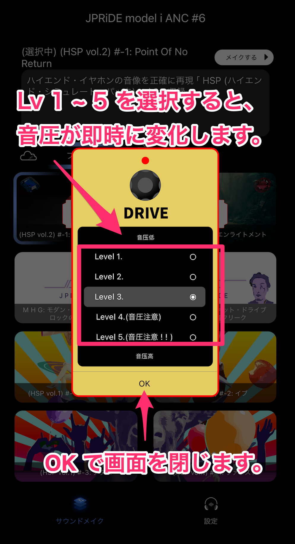 * 音圧低 Lv. 1 〜 Lv. 5 音圧高